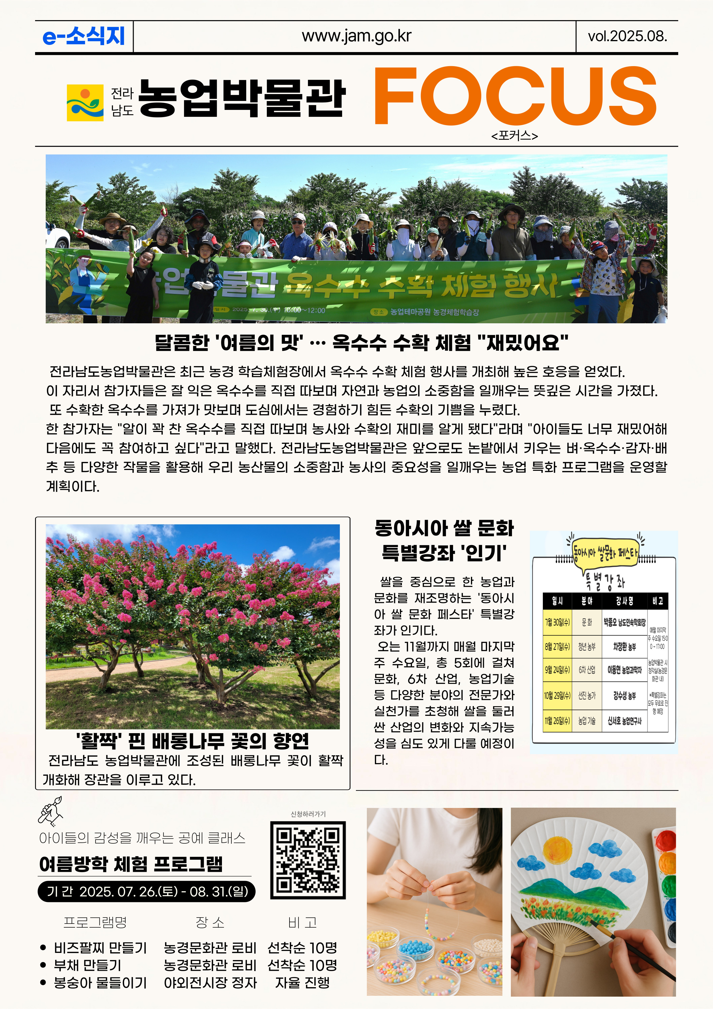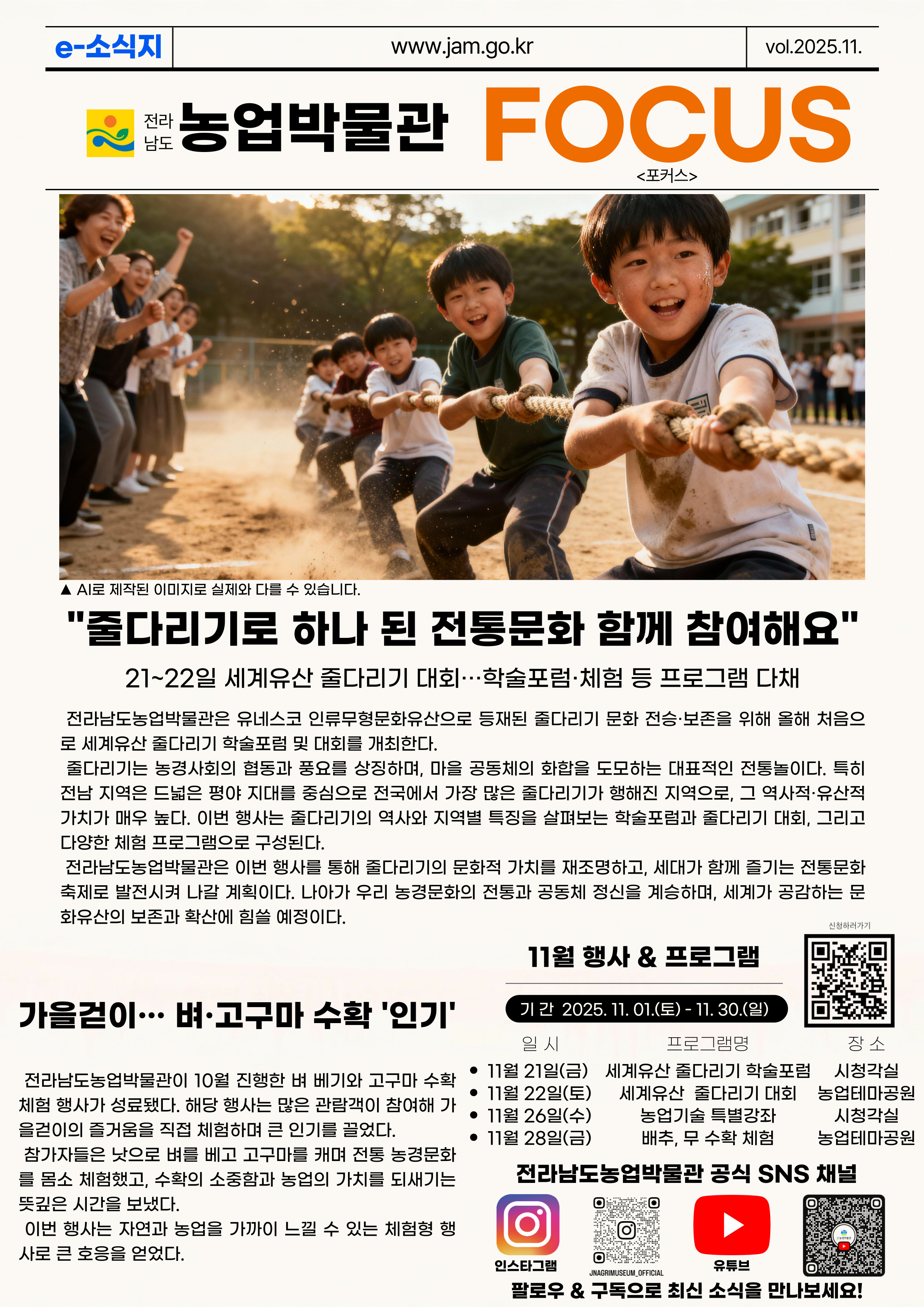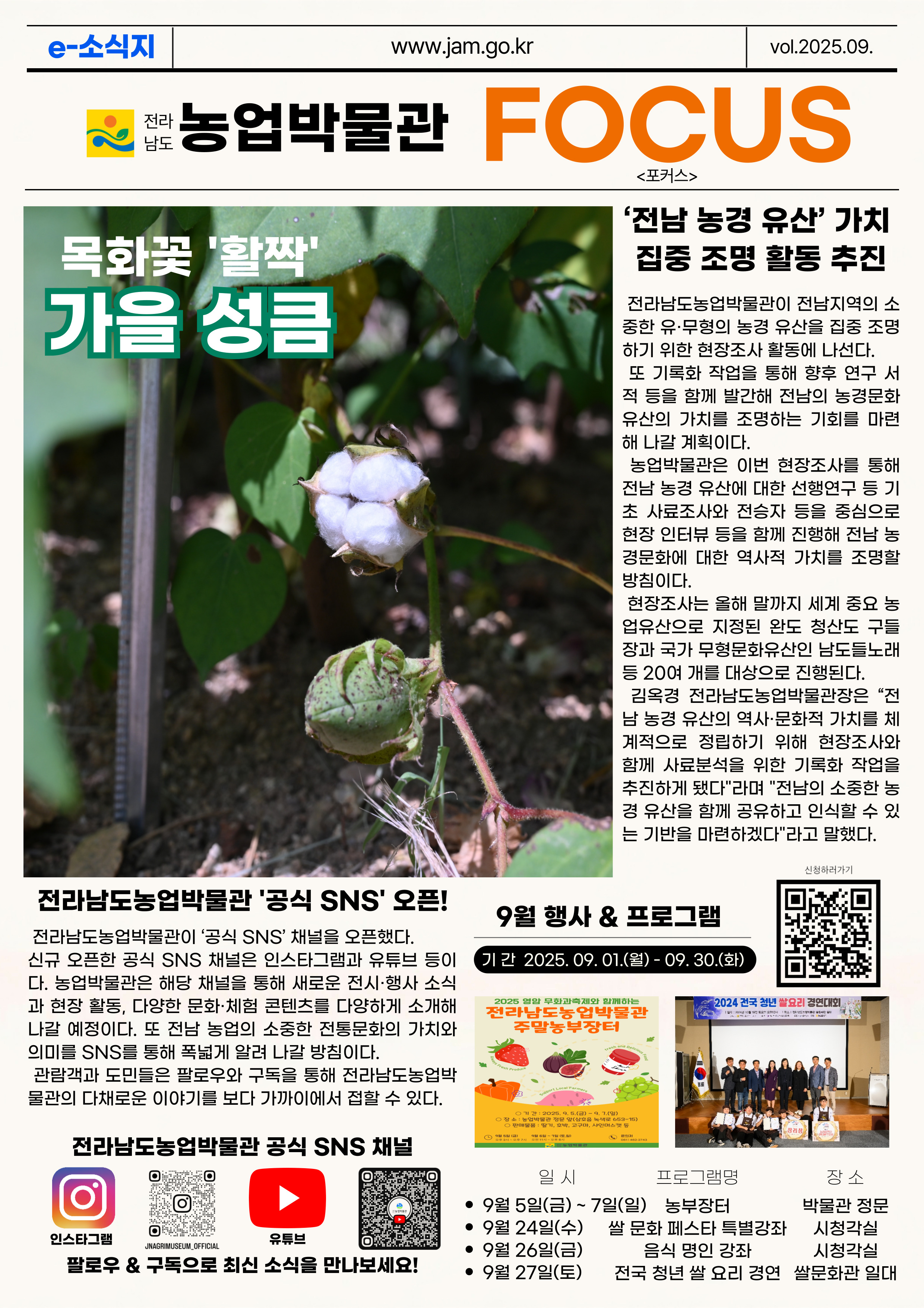 fnctId=bbs,fnctNo=142 게시물 검색 제목 작성자 RSS 2.0 총 5 개의 게시물이 있습니다. 게시글 리스트 11월 e-소식지 FOCUS<포커스> 작성일 2025.11.05 작성자 운영자02 조회 46 썸네일 자세히 보기 10월 e-소식지 FOCUS<포커스> 작성일 2025.10.01 작성자 운영자02 조회 67 썸네일 자세히 보기 9월 e-소식지 FOCUS<포커스> 작성일 2025.09.03 작성자 운영자02 조회 63 썸네일 자세히 보기 8월 e-소식지 FOCUS<포커스> 작성일 2025.08.19 작성자 운영자02 조회 90 썸네일 자세히 보기 제1회 봄철 주말 농부장터(4. 1.) 작성일 2023.04.16 작성자 관리자 조회 605 썸네일 자세히 보기 처음 11 1 끝